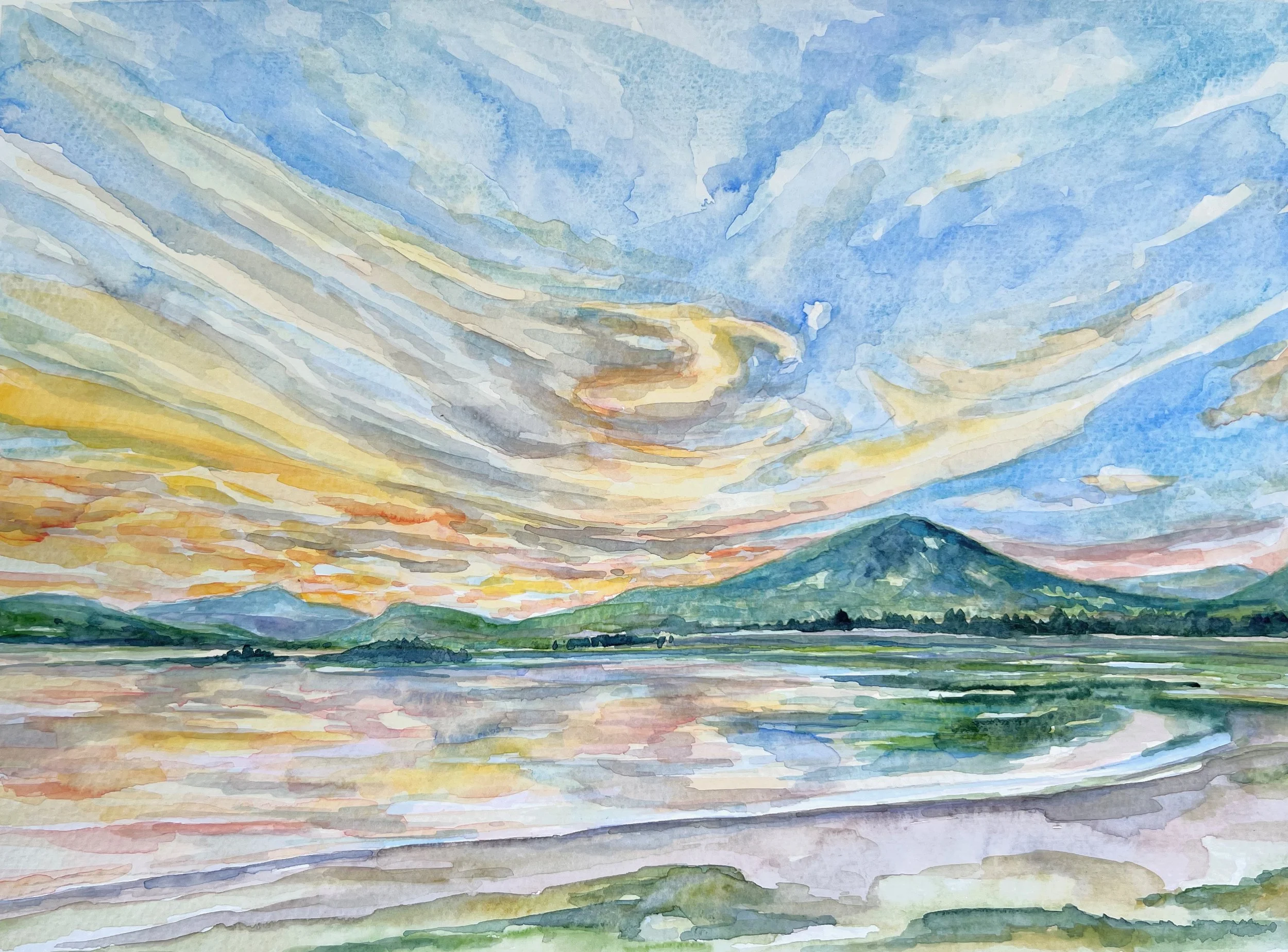 I am continually fascinated with the complexity, the resilience, and the ever-shifting nature of the landscape. By drawing a simple line across a piece of paper, a scene emerges: sky above, land or water below. Though simple in its construction, the lakescape, landscape, or skyscape can emerge as the most complex and powerful composition of all. I strive through my work to translate all of my senses of the wind and weather, sounds and silence, light and shadow, energy and stillness of nature’s sublime onto a sketchbook page or painting surface. This is the greatest of motivators for me as an artist as it drives me to deconstruct and reconstruct the elements and echoes of what I see, hear, and feel in the presence of nature’s wonder. As a traveling artist and art activist, I have crisscrossed the US and Europe seeking awe-inspiring wild and rural place to capture and record through art and give a visual voice to the promote conservation and preservation of natural spaces.